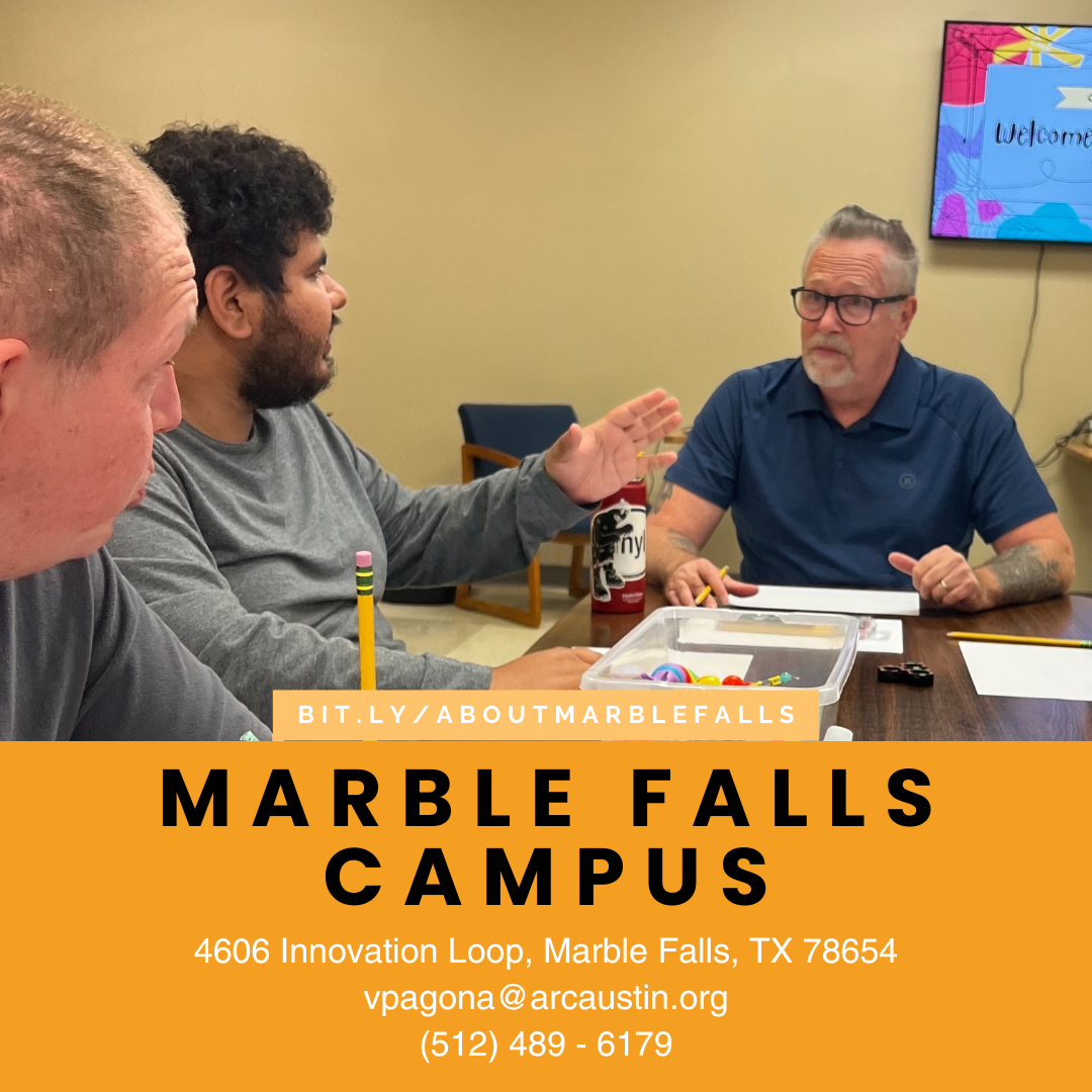 Our Marble Falls Campus is a welcoming and engaging space located at 4606 Innovation Loop, Marble Falls, TX 78654, dedicated to serving adults with intellectual and developmental disabilities throughout the Marble Falls and Highland Lakes area. Our program currently operates from 8:30 am to 2:30 pm, Monday, Wednesday, and Friday, offering a supportive, enriching, and community-centered experience. Full week schedule coming soon.